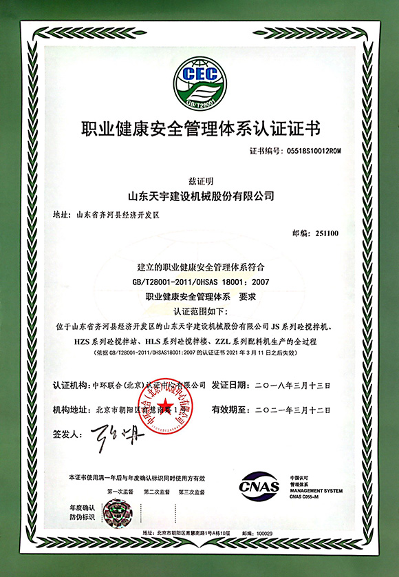 職業(yè)健康安全管理體系認證證書